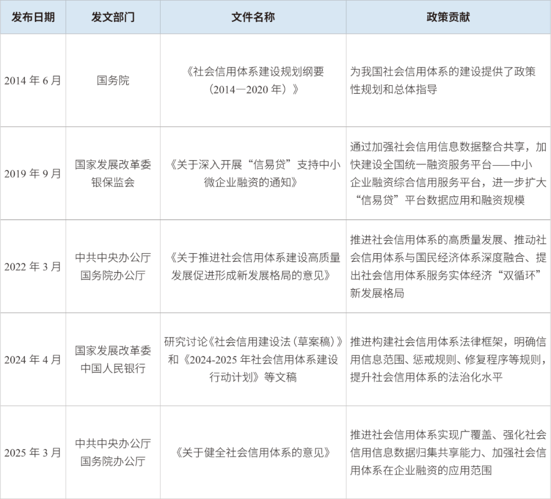 黨中央、國務(wù)院高度重視我國社會(huì)信用體系的建設(shè),陸續(xù)出臺(tái)了一系列相關(guān)政策文件以推動(dòng)社會(huì)信用體系的發(fā)展與推廣應(yīng)用,為社會(huì)信用體系在企業(yè)融資領(lǐng)域的有效應(yīng)用提供了強(qiáng)有力的政策支持和保障。