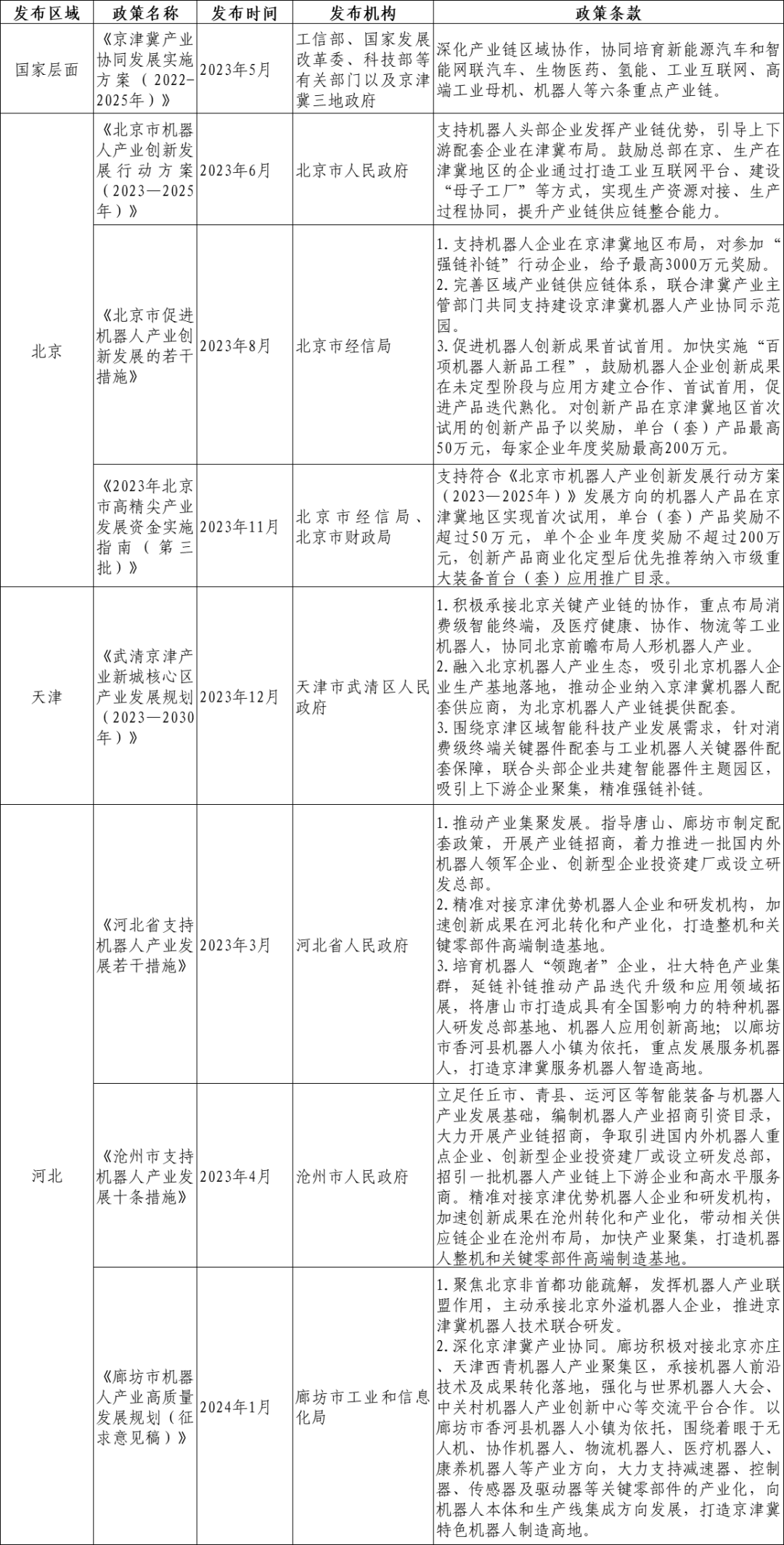 《北京市機(jī)器人產(chǎn)業(yè)創(chuàng)新發(fā)展行動方案(2023—2025年)》鼓勵國內(nèi)外企業(yè)在京設(shè)立機(jī)器人功能總部、研發(fā)機(jī)構(gòu)、培訓(xùn)機(jī)構(gòu)等。《武清京津產(chǎn)業(yè)新城核心區(qū)產(chǎn)業(yè)發(fā)展規(guī)劃(2023—2030年)》中提出要大力引進(jìn)國際龍頭企業(yè),重點(diǎn)對接國際工業(yè)機(jī)器人頭部企業(yè),通過引入?yún)^(qū)域總部、鼓勵武清頭部企業(yè)與國際企業(yè)設(shè)立合資公司等形式。《河北省支持機(jī)器人產(chǎn)業(yè)發(fā)展的若干措施》中也提出開展產(chǎn)業(yè)鏈招商,著力推進(jìn)一批國內(nèi)外機(jī)器人領(lǐng)軍企業(yè)、創(chuàng)新型企業(yè)投資建廠或設(shè)立研發(fā)總部,招引一批機(jī)器人相關(guān)企業(yè)和高水平服務(wù)商。