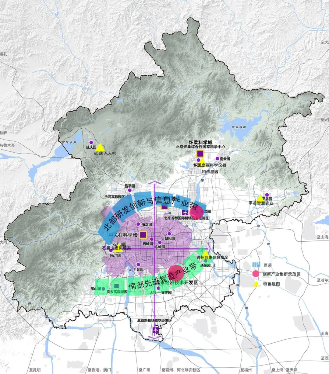 (一)遵循北京市高精尖產業發展規劃布局?!侗本┦?ldquo;十四五”時期高精尖產業發展規劃》(簡稱“高精尖規劃”)中提出打造“一區兩帶多組團”分區發展格局。即提升“一區”產業能級,在北京經濟技術開發區、順義區建設創新型產業集群示范區;全力打造南北兩個產業聚集帶,北部以海淀區、昌平區、朝陽區為核心打造研發創新與信息產業帶,南部以豐臺區、大興區、房山區為核心打造先進智造產業帶;加快建設一批特色鮮明的產業組團,重點促進通州區網絡信息安全產業、石景山區虛擬現實產業、懷柔區高端科學儀器和傳感器產業、延慶區無人機產業等組團發展。