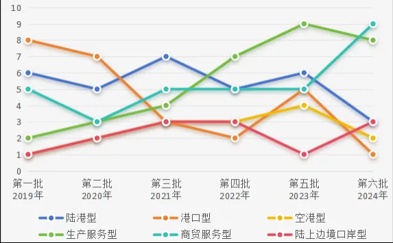 已發(fā)布樞紐的類型結(jié)構(gòu)以陸港型、生產(chǎn)服務型和商貿(mào)服務型為主,與規(guī)劃布局大體一致。近三年樞紐建設類型已逐步向生產(chǎn)服務型和商貿(mào)服務型偏移,商貿(mào)服務型2024年發(fā)布數(shù)量取得爆發(fā)式增長,但總體占比相較規(guī)劃布局仍略有偏差,未來仍屬建設重點。