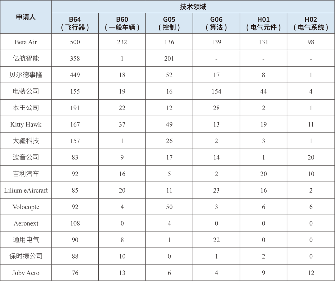 表1 全球重點(diǎn)申請(qǐng)人eVTOL領(lǐng)域?qū)@夹g(shù)布局(單位:件)