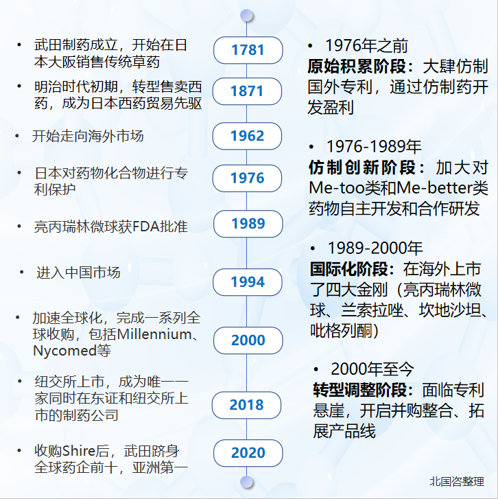 卷首語: 醫藥健康是全球新一輪科技產業變革中最為密集、投資最為活躍的領域,具備“高風險、高投入、高回報、長周期”的典型特征,10年研發周期、10億美元投入、低于10%的成功率成為原創重磅級產品創新的行業共識。 21世紀之前,中國以化學藥為主的醫藥制造業基礎薄弱,基本依靠仿制藥發展,90年代數家國內藥企依托首仿藥成長成為本土龍頭企業。2000年以來,在國家戰略布局、重大新藥創制專項等促進下,在政策、資本、人才等多因素共同驅動下,我國生物醫藥自主創新進程加快,創新層次從派生藥(Me-too)、改進藥(Me-better)向原研首創藥(Me-first)攀升,尤其是近年來,審評審批改革、上市許可持有人制度(MAH)等拉動創新型藥品醫療器械臨床和上市提速,仿制藥一致性評價和醫保改革倒逼加大創新投入,CXO賦能進一步加速創新研發進程,醫藥領域創新不斷蓄力、加快轉化為發展新動能。 本研究通過對國內外典型藥企創新產品研發模式進行案例分析,歸納梳理了“以仿養創”的轉型升級之路、巨頭企業的融合發展之路、從Biotech到Biopharma的自我成長之路、License in/out的借力起飛之路共四類模式(分四期連載),以期在全球醫藥健康科技和產業激烈的競爭浪潮中,為尋找中國創新藥企業加速騰飛的錨點提供參考借鑒。本期請關注:“以仿養創”的轉型升級之路。 第一期 “以仿養創”的轉型升級之路 “以仿養創”是指仿制藥企業通過仿制藥打開市場,依托仿制藥端持續、穩定的現金流,為高投入、長周期的創新藥研發不斷造血,經歷了仿制藥研發、仿創結合、自主創新的發展路徑,最終實現創新藥成功上市,幫助企業完成轉型。卷首語: 一、恒瑞醫藥 (一)基本信息 恒瑞醫藥成立于1970年,是當前中國醫藥行業最具有綜合實力的龍頭企業,其通過“以仿養創”模式,已成為國產創新藥Big Pharma,國際影響力突出。在PharmExec(美國制藥經理人雜志)公布的2022年全球制藥企業TOP50榜單中,恒瑞位居第32名,是中國唯一進入前35名的企業。現市值達3000億元,穩坐A股上市藥企第一寶座。恒瑞產品聚焦于三個主營板塊(抗腫瘤藥物,麻醉鎮痛和造影劑),在國內業務市場均占有領先位置。根據PDB數據庫,抗腫瘤藥物方面,2021年恒瑞在國內醫院的市占率達到5.72%,位列第二,第一為羅氏(10.74%)。 作為“以仿養創”的國內典型企業,恒瑞在1990s布局首仿藥,率先仿制國外專利藥。如恒瑞是國內第一家仿制多西他賽(賽諾菲-安萬特)的企業,并于2002年9月30日獲得上市批文。此后十年磨一劍,于2011年上市了其第一款創新藥艾瑞昔布,打破了鎮痛領域長期被國際醫藥巨頭壟斷的尷尬現實。 近年來,恒瑞的創新藥進入收獲期。截至2023年7月,恒瑞醫藥共上市13款創新藥,其中11款近五年獲批。且創新藥業務占比逐年上升,2022年創新藥貢獻了恒瑞營收的38.15%,恒瑞距離完成從仿制藥企業向創新藥企業(創新藥收入占比超過50%)的蛻變指日可待。 (二)發展歷程 (三)特點總結 意識先行,先行業而動。恒瑞1990年從基礎原料藥向仿制藥轉型,之后開始布局創新藥,從“仿制藥生產”到“仿創結合”,再到現在的“創新驅動”,恒瑞每一次改革都趕在行業變遷的前面,牢牢把握住醫藥行業的發展規律。 一以貫之,重視創新研發。恒瑞在2022年業績下滑,但其研發強度依舊提升至29.83%,已反超全球研發投入最多的10大藥企(平均研發強度19%),并遠高于我國A股生物醫藥公司(平均研發強度4.6%)。高強度的研發投入也讓恒瑞以13款創新藥位列國內藥企第一。 “大國”視野,推進國際化進程。恒瑞積極拓展海外市場,早在2009年,恒瑞的磷酸瑞格列汀臨床研究就進行了中美雙報,并獲得了批準。近些年,恒瑞陸續將卡瑞利珠單抗、吡咯替尼、SHR-1701等授權出讓給國際知名藥企,推動恒瑞醫藥走向國際。去年5月,恒瑞醫藥成立了全資子公司Luzsana Biotechnology,負責恒瑞醫藥管線產品的國際化。 行而不輟,靜待花開。創新藥的研發投入高、周期長、風險高,巨大的研發成本使得許多藥企望而卻步,但是恒瑞沒有放棄,在經歷許多研發失敗的情況下,亦堅持不懈,耐得住寂寞,直到研發創新藥成功為止。目前恒瑞有240多項臨床試驗在國內外開展,建立了梯隊化的產品管線,積累了豐富的創新藥研發儲備。 二、武田制藥 (一)基本信息 武田制藥于1781年(相當于乾隆后期)在日本素有“醫藥城”之稱的大阪府成立,是當前亞洲最大的制藥企業,位居全球藥企前10強。近年來,武田制藥在其五個主要業務領域:腫瘤、罕見病、神經科學、消化和血液制品等各領域都研制出引人矚目的高效藥物。其消化領域的明星產品Entyvio(維得利珠單抗)是目前炎癥性腸?。↖BD)領域唯一的腸道選擇性生物制劑,具有市場獨占權。腫瘤領域的莫博賽替尼(mobocertinib)是全球首款也是目前唯一獲批的治療EGFR 20號外顯子插入突變晚期非小細胞肺癌的口服靶向藥物,疾病控制率(DCR)高達78%。 作為“以仿養創”的國際化典范,武田制藥的發展歷程經歷了“普藥→仿制藥→仿創藥→創新藥”四個階段。其最開始只進行普藥銷售,在日本對藥物化合物進行專利保護,且嚴格區分新藥和仿制藥的價格差距后,武田加大對Me-too類和Me-better類藥物的自主開發和合作研發。1980-2000年,其研發上市了仿創藥四大重磅產品(亮丙瑞林微球、蘭索拉唑、坎地沙坦、吡格列酮),為其創收了大量的原始資本。之后,武田重磅藥