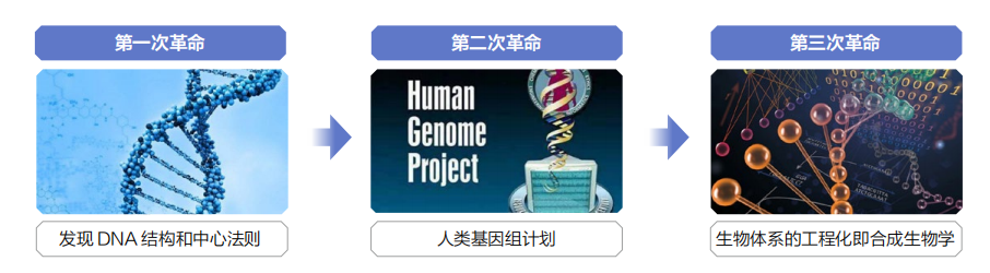 合成生物學自概念提出到現在發展歷史已超百年。最早可溯源至19世紀中葉合成化學的出現打破無機物和有機物的界限,推翻“生命力論”,顛覆了人類對生命體(動物、植物、微生物等)的認知。此后,“細胞學說”“生物化學”“遺傳學說”等相繼提出,人類從細胞層面、分子層面實現對生命體認識的飛躍,合成生物學亦隨之演化。總體看,合成生物學發展歷程大致可分為三大階段: