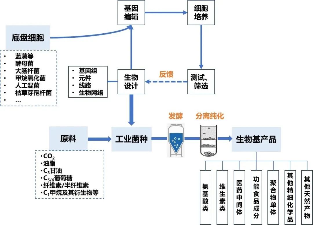 結合合成生物制造流程來看,其本質就是“細胞工廠”,通過基因技術編輯底盤細胞,將生物碳基原料置于底盤細胞中進行發酵,之后采用多種技術將發酵產品從發酵液或者細胞中分離、純化出來,在達到特定標準后制成產品。更通俗地理解,底盤細胞相當于奶牛,各種原料相當于低價值的草料,通過改造優化過的底盤細胞,添加低廉原料后經過發酵等一系列工藝產生的高價值的化學或生物產品。